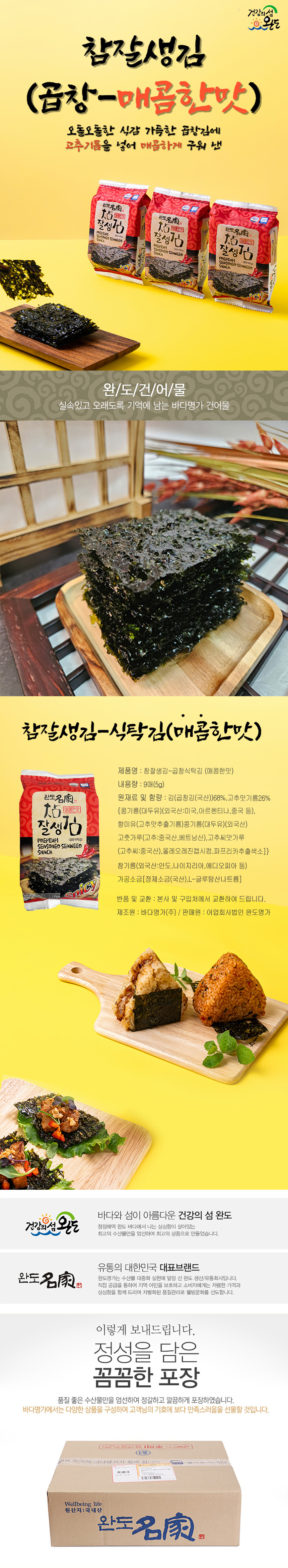 - 제품명: 참잘생김식탁(곱창김-매콤한맛)(조미) / 중량(입수량) : 9매(5g)x30봉