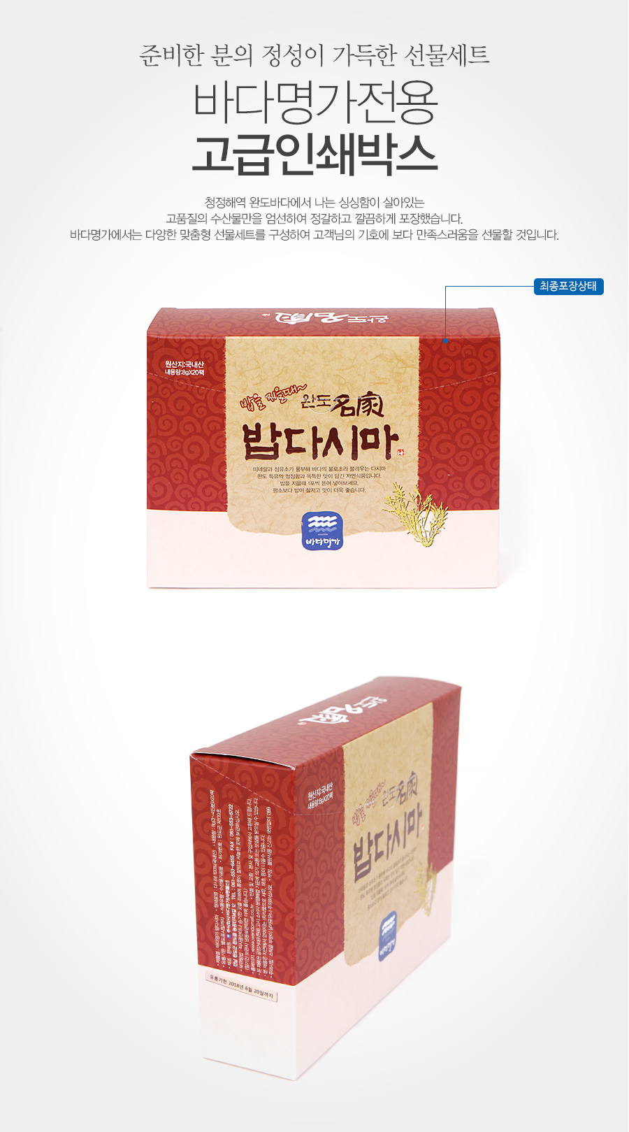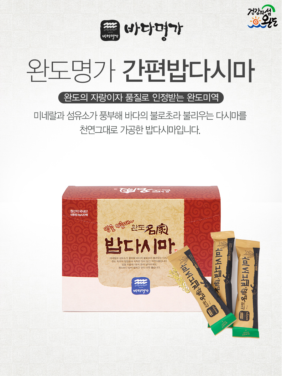 - 생산자 및 소재지: 제조/판매원 : 주식회사 바다명가 / 전남 완도군 완도읍 농공단지4길 12