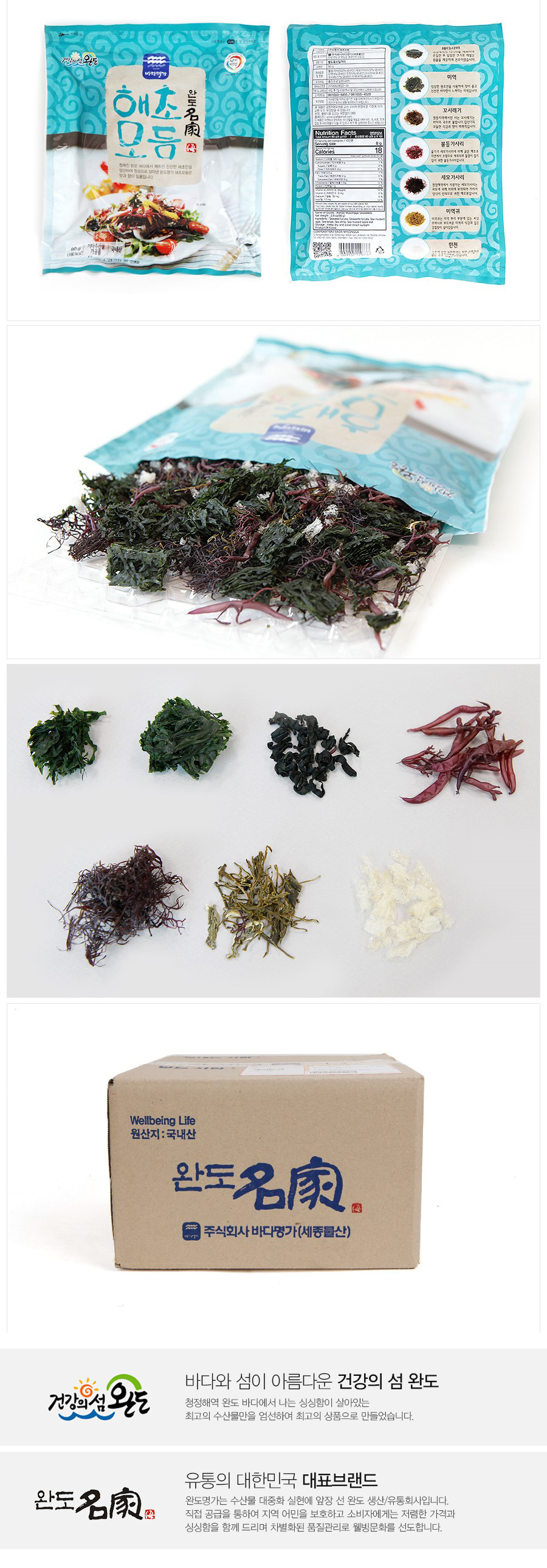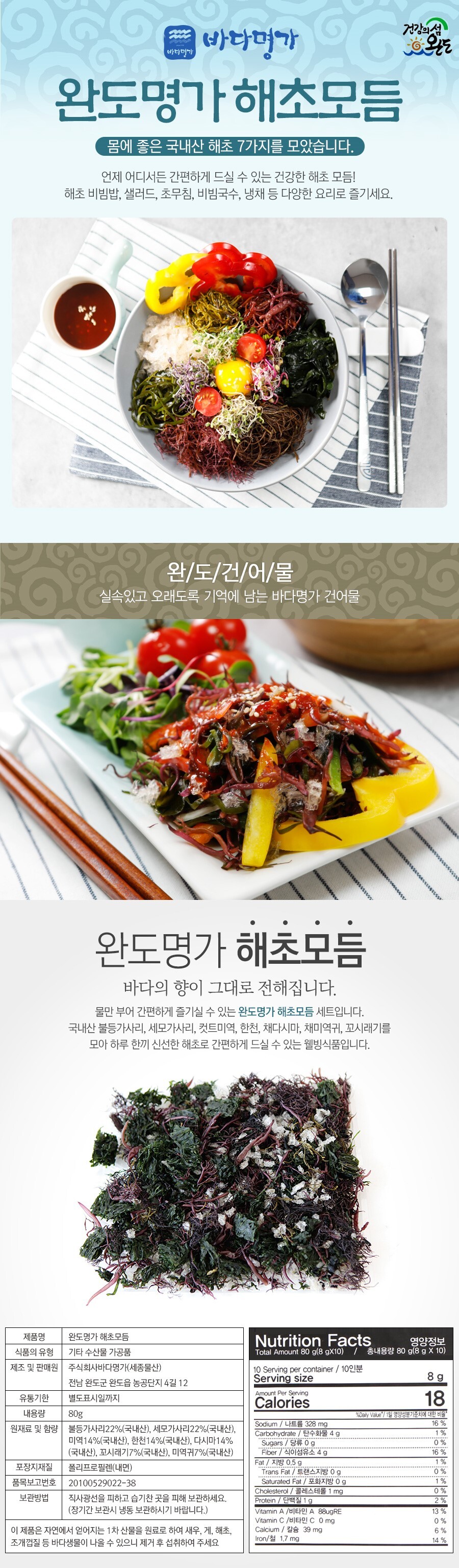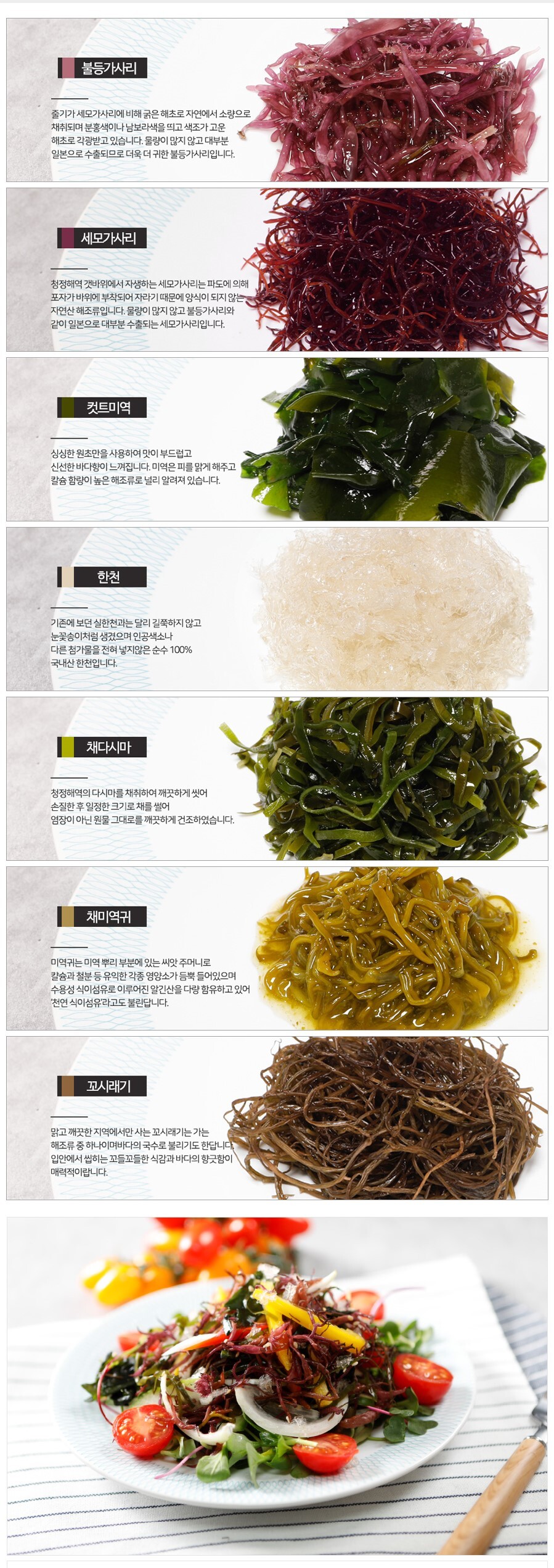 - 원재료명 및 함량: 불등가사리22%(국내산),세모가사리22%(국내산),미역14%(국내산), 한천14%(국내산),다시마14%(국내산),꼬시래기7%(국내산),미역귀7%(국내산)